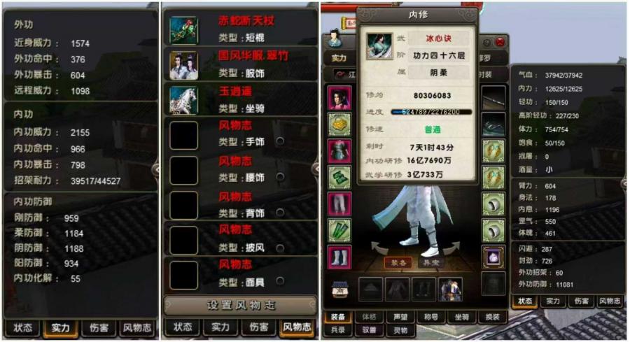 阴单脉武当辟邪清风魅影,爆率三合一高数值金简,技能辟邪+清风,86混元,75逆天六道,51冰心,全玉娃娃,全套古谱太极拳12层蓝光开,带三技能开太极护腕,全套魅影6 7层,魅影三技能剑,清风三技能剑,12层辟邪,带6把三技能剑带效果武技,10层雪斋,三技能寒心,三技能疏影无痕,各类金图解海多,主要小奇珍基本吃满,会心279+200