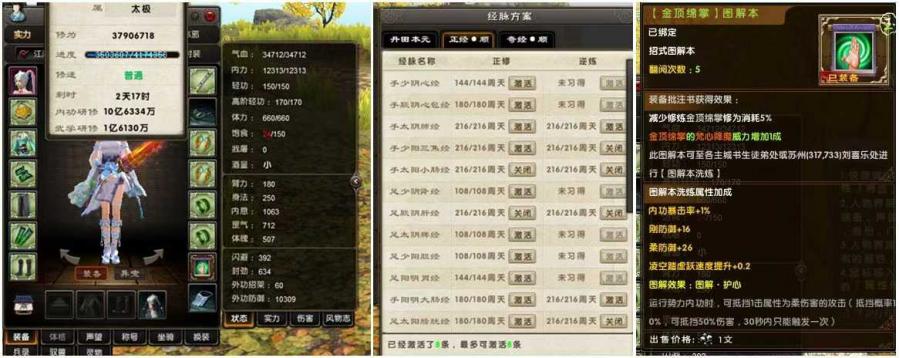 月明沧海出降暴忽视四合一峨眉,多一块宝物,研修10.6亿,混元68,古谱揽雀尾,一套龙爪大招10,其余6-8,装备匣金鼎梵心三星,雪斋大招三星,龙爪大招三星,门派花神三星神鬼,包里有双倏影刀和剑在洗,双隐会心35/45,至尊马霜雪骓,包里还有若干残卷
