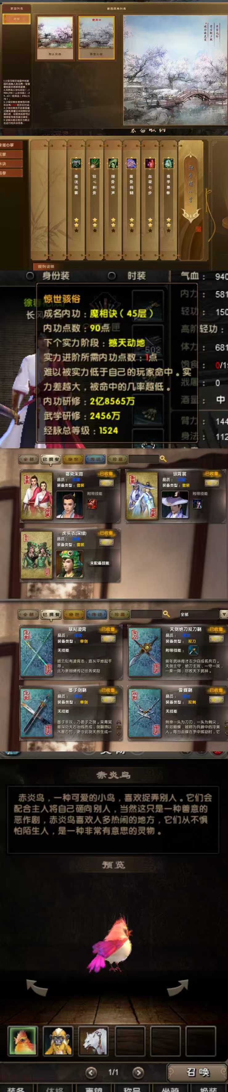沧海一笑出府邸五品套内功极乐,研修2亿8565(区15)经脉1526(区10),全二毒掌武器匣、爆率爆伤+爆伤爆免两套心魔宝物,百兽41,府邸(雪)风物志、三套衣服风物志、天剑绝刀武器、墨子剑鞘、雪蝶鞘、三灵宠